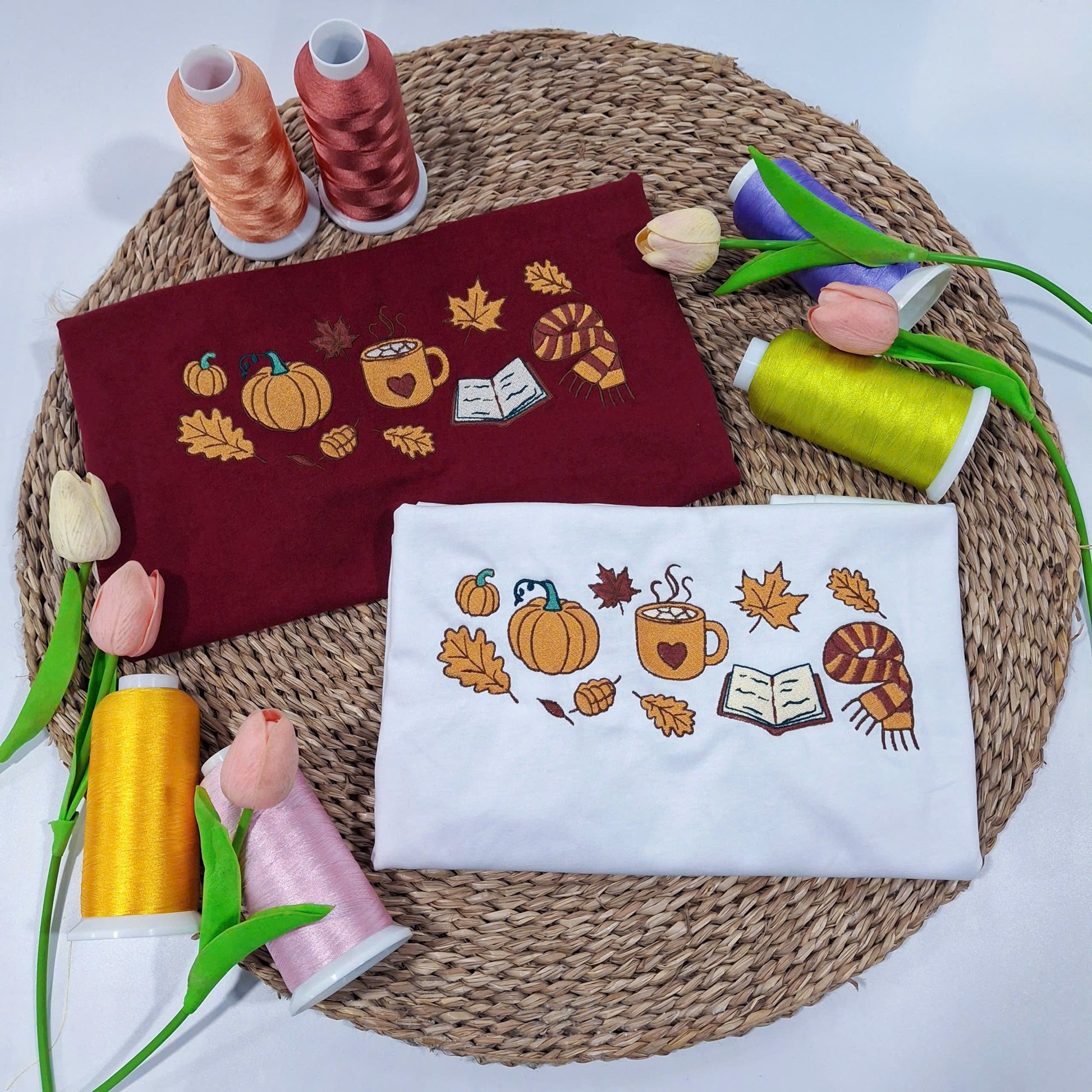 Autumn Embroidery Design – Cozy Fall Pumpkins, Coffee, Leaves, Book & Scarf Pattern for Sweatshirts & Gifts